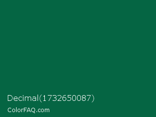 Decimal 1732650087 Color is a very dark green color and the nearest color is Cadmium Green #006b3c. Hex code #056543 and RGB value is rgb(5,101,67). In RGB color space, this color is composed of 2% red, 40% green, 26% blue, In CMYK color space, this color is composed of 95% cyan, 0% magenta, 34% yellow , 60% black , In HSL color space, this color has a hue angle of 159° , 91% saturation and 21% lightness.