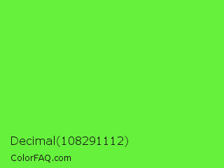 Decimal 108291112 Color is a normal green color and the nearest color is Spring Frost #87ff2a. Hex code #66f13c and RGB value is rgb(102,241,60). In RGB color space, this color is composed of 40% red, 95% green, 24% blue, In CMYK color space, this color is composed of 58% cyan, 0% magenta, 75% yellow , 5% black , In HSL color space, this color has a hue angle of 106° , 87% saturation and 59% lightness.