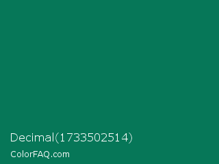 Decimal 1733502514 Color is a dark cyan color and the nearest color is Watercourse #056f57. Hex code #067758 and RGB value is rgb(6,119,88). In RGB color space, this color is composed of 2% red, 47% green, 35% blue, In CMYK color space, this color is composed of 95% cyan, 0% magenta, 26% yellow , 53% black , In HSL color space, this color has a hue angle of 164° , 90% saturation and 25% lightness.