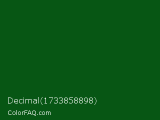 Decimal 1733858898 Color is a very dark green color and the nearest color is Camarone #00581a. Hex code #075614 and RGB value is rgb(7,86,20). In RGB color space, this color is composed of 3% red, 34% green, 8% blue, In CMYK color space, this color is composed of 92% cyan, 0% magenta, 77% yellow , 66% black , In HSL color space, this color has a hue angle of 130° , 85% saturation and 18% lightness.