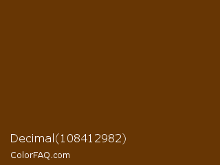 Decimal 108412982 Color is a very dark orange color and the nearest color is Nutmeg Wood Finish #683600. Hex code #673604 and RGB value is rgb(103,54,4). In RGB color space, this color is composed of 40% red, 21% green, 2% blue, In CMYK color space, this color is composed of 0% cyan, 48% magenta, 96% yellow , 60% black , In HSL color space, this color has a hue angle of 30° , 93% saturation and 21% lightness.