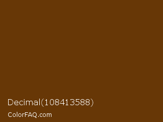 Decimal 108413588 Color is a very dark orange color and the nearest color is Nutmeg Wood Finish #683600. Hex code #673706 and RGB value is rgb(103,55,6). In RGB color space, this color is composed of 40% red, 22% green, 2% blue, In CMYK color space, this color is composed of 0% cyan, 47% magenta, 94% yellow , 60% black , In HSL color space, this color has a hue angle of 30° , 89% saturation and 21% lightness.
