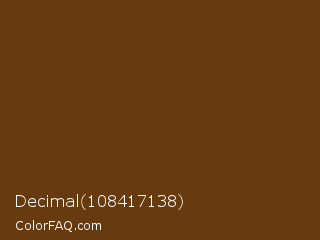Decimal 108417138 Color is a dark orange color and the nearest color is Pullman Brown UPS Brown #644117. Hex code #673a10 and RGB value is rgb(103,58,16). In RGB color space, this color is composed of 40% red, 23% green, 6% blue, In CMYK color space, this color is composed of 0% cyan, 44% magenta, 84% yellow , 60% black , In HSL color space, this color has a hue angle of 29° , 73% saturation and 23% lightness.