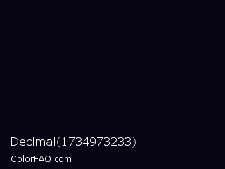 Decimal 1734973233 Color is a almost black indigo color and the nearest color is Jaguar #080110. Hex code #090413 and RGB value is rgb(9,4,19). In RGB color space, this color is composed of 4% red, 2% green, 7% blue, In CMYK color space, this color is composed of 53% cyan, 79% magenta, 0% yellow , 93% black , In HSL color space, this color has a hue angle of 260° , 65% saturation and 5% lightness.