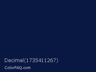 Decimal 1735411267 Color is a very dark blue color and the nearest color is Deep Cove #051040. Hex code #091743 and RGB value is rgb(9,23,67). In RGB color space, this color is composed of 4% red, 9% green, 26% blue, In CMYK color space, this color is composed of 87% cyan, 66% magenta, 0% yellow , 74% black , In HSL color space, this color has a hue angle of 226° , 76% saturation and 15% lightness.