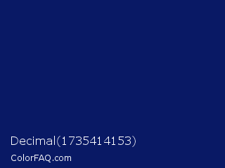 Decimal 1735414153 Color is a very dark blue color and the nearest color is Deep Sapphire #082567. Hex code #091965 and RGB value is rgb(9,25,101). In RGB color space, this color is composed of 4% red, 10% green, 40% blue, In CMYK color space, this color is composed of 91% cyan, 75% magenta, 0% yellow , 60% black , In HSL color space, this color has a hue angle of 230° , 84% saturation and 22% lightness.