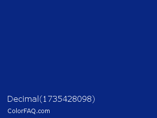 Decimal 1735428098 Color is a dark blue color and the nearest color is Catalina Blue #062a78. Hex code #092782 and RGB value is rgb(9,39,130). In RGB color space, this color is composed of 4% red, 15% green, 51% blue, In CMYK color space, this color is composed of 93% cyan, 70% magenta, 0% yellow , 49% black , In HSL color space, this color has a hue angle of 225° , 87% saturation and 27% lightness.