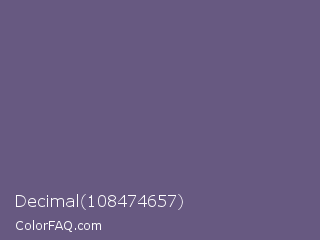 Decimal 108474657 Color is a normal violet color and the nearest color is Dolphin #646077. Hex code #675981 and RGB value is rgb(103,89,129). In RGB color space, this color is composed of 40% red, 35% green, 51% blue, In CMYK color space, this color is composed of 20% cyan, 31% magenta, 0% yellow , 49% black , In HSL color space, this color has a hue angle of 261° , 18% saturation and 43% lightness.