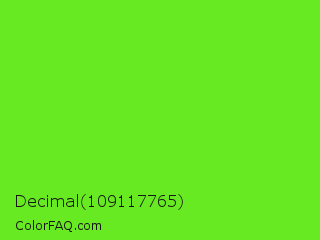 Decimal 109117765 Color is a normal green color and the nearest color is Bright Green #66ff00. Hex code #67ea21 and RGB value is rgb(103,234,33). In RGB color space, this color is composed of 40% red, 92% green, 13% blue, In CMYK color space, this color is composed of 56% cyan, 0% magenta, 86% yellow , 8% black , In HSL color space, this color has a hue angle of 99° , 83% saturation and 52% lightness.