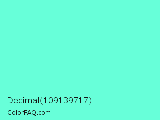 Decimal 109139717 Color is a light cyan color and the nearest color is Aquamarine #7fffd4. Hex code #67ffd9 and RGB value is rgb(103,255,217). In RGB color space, this color is composed of 40% red, 100% green, 85% blue, In CMYK color space, this color is composed of 60% cyan, 0% magenta, 15% yellow , 0% black , In HSL color space, this color has a hue angle of 165° , 100% saturation and 70% lightness.