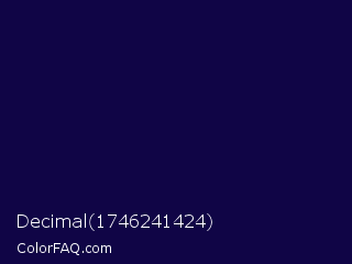Decimal 1746241424 Color is a very dark indigo color and the nearest color is Tolopea #1b0245. Hex code #100546 and RGB value is rgb(16,5,70). In RGB color space, this color is composed of 6% red, 2% green, 27% blue, In CMYK color space, this color is composed of 77% cyan, 93% magenta, 0% yellow , 73% black , In HSL color space, this color has a hue angle of 250° , 87% saturation and 15% lightness.