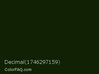 Decimal 1746297159 Color is a almost black green color and the nearest color is Pine Tree #171f04. Hex code #102203 and RGB value is rgb(16,34,3). In RGB color space, this color is composed of 6% red, 13% green, 1% blue, In CMYK color space, this color is composed of 53% cyan, 0% magenta, 91% yellow , 87% black , In HSL color space, this color has a hue angle of 95° , 84% saturation and 7% lightness.