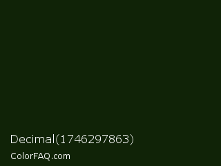 Decimal 1746297863 Color is a almost black green color and the nearest color is Pine Tree #171f04. Hex code #102307 and RGB value is rgb(16,35,7). In RGB color space, this color is composed of 6% red, 14% green, 3% blue, In CMYK color space, this color is composed of 54% cyan, 0% magenta, 80% yellow , 86% black , In HSL color space, this color has a hue angle of 101° , 67% saturation and 8% lightness.