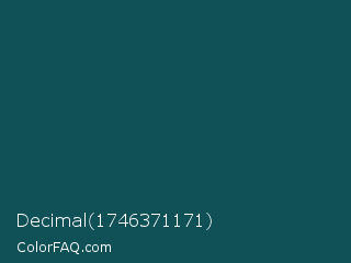 Decimal 1746371171 Color is a very dark cyan color and the nearest color is Eden #105852. Hex code #105157 and RGB value is rgb(16,81,87). In RGB color space, this color is composed of 6% red, 32% green, 34% blue, In CMYK color space, this color is composed of 82% cyan, 7% magenta, 0% yellow , 66% black , In HSL color space, this color has a hue angle of 185° , 69% saturation and 20% lightness.