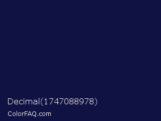 Decimal 1747088978 Color is a very dark blue color and the nearest color is Deep Cove #051040. Hex code #111244 and RGB value is rgb(17,18,68). In RGB color space, this color is composed of 7% red, 7% green, 27% blue, In CMYK color space, this color is composed of 75% cyan, 74% magenta, 0% yellow , 73% black , In HSL color space, this color has a hue angle of 239° , 60% saturation and 17% lightness.
