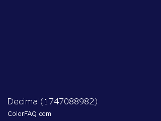 Decimal 1747088982 Color is a very dark blue color and the nearest color is Bunting #151f4c. Hex code #111248 and RGB value is rgb(17,18,72). In RGB color space, this color is composed of 7% red, 7% green, 28% blue, In CMYK color space, this color is composed of 76% cyan, 75% magenta, 0% yellow , 72% black , In HSL color space, this color has a hue angle of 239° , 62% saturation and 17% lightness.