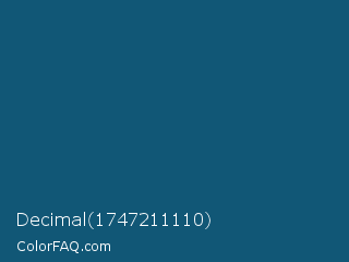 Decimal 1747211110 Color is a dark blue color and the nearest color is Chathams Blue #175579. Hex code #115776 and RGB value is rgb(17,87,118). In RGB color space, this color is composed of 7% red, 34% green, 46% blue, In CMYK color space, this color is composed of 86% cyan, 26% magenta, 0% yellow , 54% black , In HSL color space, this color has a hue angle of 198° , 75% saturation and 26% lightness.