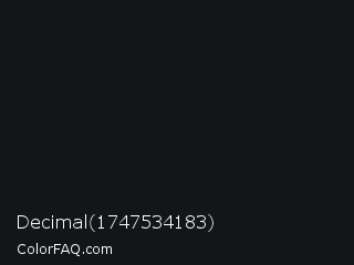 Decimal 1747534183 Color is a almost black cyan color and the nearest color is Bunker #0d1117. Hex code #121617 and RGB value is rgb(18,22,23). In RGB color space, this color is composed of 7% red, 9% green, 9% blue, In CMYK color space, this color is composed of 22% cyan, 4% magenta, 0% yellow , 91% black , In HSL color space, this color has a hue angle of 192° , 12% saturation and 8% lightness.
