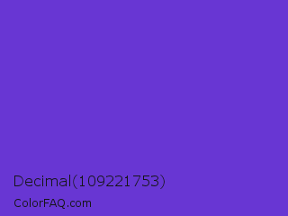 Decimal 109221753 Color is a normal indigo color and the nearest color is Purple Heart Crayola #652dc1. Hex code #6836d3 and RGB value is rgb(104,54,211). In RGB color space, this color is composed of 41% red, 21% green, 83% blue, In CMYK color space, this color is composed of 51% cyan, 74% magenta, 0% yellow , 17% black , In HSL color space, this color has a hue angle of 259° , 64% saturation and 52% lightness.