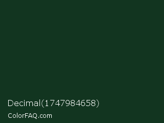 Decimal 1747984658 Color is a very dark green color and the nearest color is Phthalo Green #123524. Hex code #123520 and RGB value is rgb(18,53,32). In RGB color space, this color is composed of 7% red, 21% green, 13% blue, In CMYK color space, this color is composed of 66% cyan, 0% magenta, 40% yellow , 79% black , In HSL color space, this color has a hue angle of 144° , 49% saturation and 14% lightness.