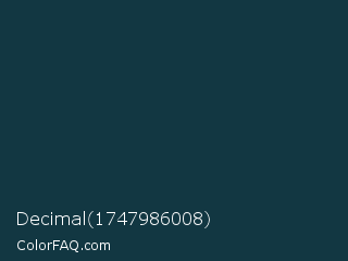 Decimal 1747986008 Color is a very dark blue color and the nearest color is Elephant #123447. Hex code #123742 and RGB value is rgb(18,55,66). In RGB color space, this color is composed of 7% red, 22% green, 26% blue, In CMYK color space, this color is composed of 73% cyan, 17% magenta, 0% yellow , 74% black , In HSL color space, this color has a hue angle of 194° , 57% saturation and 16% lightness.