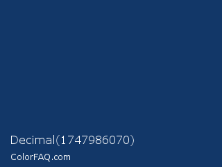 Decimal 1747986070 Color is a dark blue color and the nearest color is Biscay #1b3162. Hex code #123768 and RGB value is rgb(18,55,104). In RGB color space, this color is composed of 7% red, 22% green, 41% blue, In CMYK color space, this color is composed of 83% cyan, 47% magenta, 0% yellow , 59% black , In HSL color space, this color has a hue angle of 214° , 70% saturation and 24% lightness.