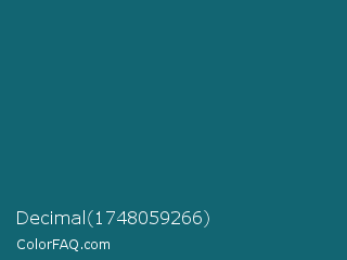 Decimal 1748059266 Color is a dark cyan color and the nearest color is Atoll #0a6f75. Hex code #126572 and RGB value is rgb(18,101,114). In RGB color space, this color is composed of 7% red, 40% green, 45% blue, In CMYK color space, this color is composed of 84% cyan, 11% magenta, 0% yellow , 55% black , In HSL color space, this color has a hue angle of 188° , 73% saturation and 26% lightness.