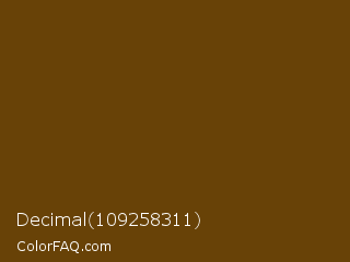 Decimal 109258311 Color is a very dark orange color and the nearest color is Cafe Royale #6f440c. Hex code #684207 and RGB value is rgb(104,66,7). In RGB color space, this color is composed of 41% red, 26% green, 3% blue, In CMYK color space, this color is composed of 0% cyan, 37% magenta, 93% yellow , 59% black , In HSL color space, this color has a hue angle of 36° , 87% saturation and 22% lightness.