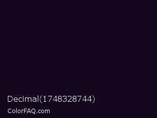 Decimal 1748328744 Color is a almost black violet color and the nearest color is Deep Ebony #0c0b1d. Hex code #130820 and RGB value is rgb(19,8,32). In RGB color space, this color is composed of 7% red, 3% green, 13% blue, In CMYK color space, this color is composed of 41% cyan, 75% magenta, 0% yellow , 87% black , In HSL color space, this color has a hue angle of 268° , 60% saturation and 8% lightness.