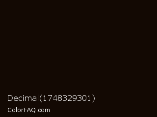 Decimal 1748329301 Color is a almost black orange color and the nearest color is Asphalt #130a06. Hex code #130903 and RGB value is rgb(19,9,3). In RGB color space, this color is composed of 7% red, 4% green, 1% blue, In CMYK color space, this color is composed of 0% cyan, 53% magenta, 84% yellow , 93% black , In HSL color space, this color has a hue angle of 23° , 73% saturation and 4% lightness.