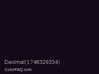 Decimal 1748329334 Color is a almost black purple color and the nearest color is Cinder #0e0e18. Hex code #130918 and RGB value is rgb(19,9,24). In RGB color space, this color is composed of 7% red, 4% green, 9% blue, In CMYK color space, this color is composed of 21% cyan, 63% magenta, 0% yellow , 91% black , In HSL color space, this color has a hue angle of 280° , 45% saturation and 6% lightness.