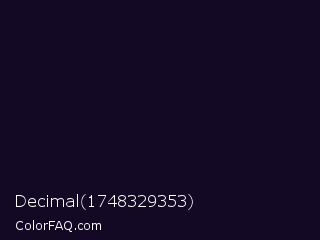 Decimal 1748329353 Color is a almost black violet color and the nearest color is Deep Ebony #0c0b1d. Hex code #130925 and RGB value is rgb(19,9,37). In RGB color space, this color is composed of 7% red, 4% green, 15% blue, In CMYK color space, this color is composed of 49% cyan, 76% magenta, 0% yellow , 85% black , In HSL color space, this color has a hue angle of 261° , 61% saturation and 9% lightness.
