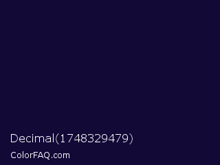 Decimal 1748329479 Color is a very dark indigo color and the nearest color is Black Rock #0d0332. Hex code #130937 and RGB value is rgb(19,9,55). In RGB color space, this color is composed of 7% red, 4% green, 22% blue, In CMYK color space, this color is composed of 65% cyan, 84% magenta, 0% yellow , 78% black , In HSL color space, this color has a hue angle of 253° , 72% saturation and 13% lightness.