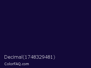 Decimal 1748329481 Color is a very dark indigo color and the nearest color is Black Rock #0d0332. Hex code #130939 and RGB value is rgb(19,9,57). In RGB color space, this color is composed of 7% red, 4% green, 22% blue, In CMYK color space, this color is composed of 67% cyan, 84% magenta, 0% yellow , 78% black , In HSL color space, this color has a hue angle of 253° , 73% saturation and 13% lightness.