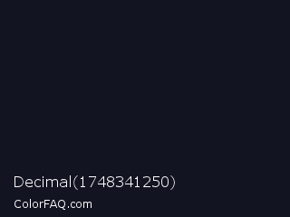 Decimal 1748341250 Color is a very dark blue color and the nearest color is Vulcan #10121d. Hex code #131422 and RGB value is rgb(19,20,34). In RGB color space, this color is composed of 7% red, 8% green, 13% blue, In CMYK color space, this color is composed of 44% cyan, 41% magenta, 0% yellow , 87% black , In HSL color space, this color has a hue angle of 236° , 28% saturation and 10% lightness.