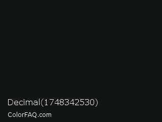 Decimal 1748342530 Color is a almost black cyan color and the nearest color is Bunker #0d1117. Hex code #131616 and RGB value is rgb(19,22,22). In RGB color space, this color is composed of 7% red, 9% green, 9% blue, In CMYK color space, this color is composed of 14% cyan, 0% magenta, 0% yellow , 91% black , In HSL color space, this color has a hue angle of 180° , 7% saturation and 8% lightness.
