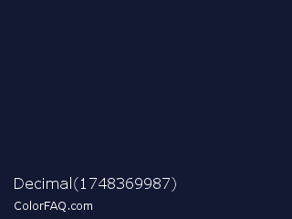 Decimal 1748369987 Color is a very dark blue color and the nearest color is Mirage #161928. Hex code #131833 and RGB value is rgb(19,24,51). In RGB color space, this color is composed of 7% red, 9% green, 20% blue, In CMYK color space, this color is composed of 63% cyan, 53% magenta, 0% yellow , 80% black , In HSL color space, this color has a hue angle of 231° , 46% saturation and 14% lightness.