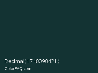 Decimal 1748398421 Color is a very dark cyan color and the nearest color is Gable Green #163531. Hex code #133333 and RGB value is rgb(19,51,51). In RGB color space, this color is composed of 7% red, 20% green, 20% blue, In CMYK color space, this color is composed of 63% cyan, 0% magenta, 0% yellow , 80% black , In HSL color space, this color has a hue angle of 180° , 46% saturation and 14% lightness.