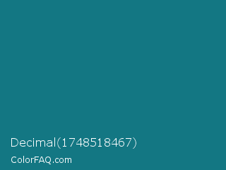 Decimal 1748518467 Color is a dark cyan color and the nearest color is Elm #1c7c7d. Hex code #137783 and RGB value is rgb(19,119,131). In RGB color space, this color is composed of 7% red, 47% green, 51% blue, In CMYK color space, this color is composed of 85% cyan, 9% magenta, 0% yellow , 49% black , In HSL color space, this color has a hue angle of 186° , 75% saturation and 29% lightness.