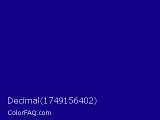 Decimal 1749156402 Color is a dark indigo color and the nearest color is Ultramarine #120a8f. Hex code #140288 and RGB value is rgb(20,2,136). In RGB color space, this color is composed of 8% red, 1% green, 53% blue, In CMYK color space, this color is composed of 85% cyan, 99% magenta, 0% yellow , 47% black , In HSL color space, this color has a hue angle of 248° , 97% saturation and 27% lightness.