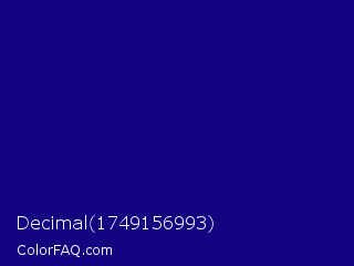 Decimal 1749156993 Color is a dark indigo color and the nearest color is Ultramarine #120a8f. Hex code #140381 and RGB value is rgb(20,3,129). In RGB color space, this color is composed of 8% red, 1% green, 51% blue, In CMYK color space, this color is composed of 84% cyan, 98% magenta, 0% yellow , 49% black , In HSL color space, this color has a hue angle of 248° , 95% saturation and 26% lightness.