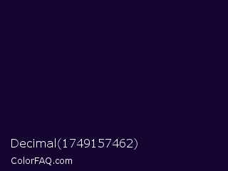 Decimal 1749157462 Color is a very dark violet color and the nearest color is Black Rock #0d0332. Hex code #140430 and RGB value is rgb(20,4,48). In RGB color space, this color is composed of 8% red, 2% green, 19% blue, In CMYK color space, this color is composed of 58% cyan, 92% magenta, 0% yellow , 81% black , In HSL color space, this color has a hue angle of 262° , 85% saturation and 10% lightness.