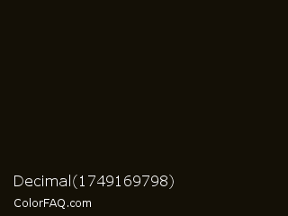 Decimal 1749169798 Color is a almost black orange color and the nearest color is Green Waterloo #101405. Hex code #141006 and RGB value is rgb(20,16,6). In RGB color space, this color is composed of 8% red, 6% green, 2% blue, In CMYK color space, this color is composed of 0% cyan, 20% magenta, 70% yellow , 92% black , In HSL color space, this color has a hue angle of 43° , 54% saturation and 5% lightness.