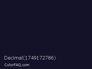 Decimal 1749172786 Color is a very dark indigo color and the nearest color is Mirage #161928. Hex code #141228 and RGB value is rgb(20,18,40). In RGB color space, this color is composed of 8% red, 7% green, 16% blue, In CMYK color space, this color is composed of 50% cyan, 55% magenta, 0% yellow , 84% black , In HSL color space, this color has a hue angle of 245° , 38% saturation and 11% lightness.