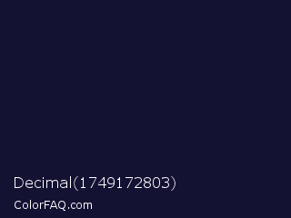 Decimal 1749172803 Color is a very dark indigo color and the nearest color is Haiti #1b1035. Hex code #141233 and RGB value is rgb(20,18,51). In RGB color space, this color is composed of 8% red, 7% green, 20% blue, In CMYK color space, this color is composed of 61% cyan, 65% magenta, 0% yellow , 80% black , In HSL color space, this color has a hue angle of 244° , 48% saturation and 14% lightness.