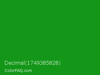 Decimal 1749385828 Color is a normal green color and the nearest color is Forest Green #228b22. Hex code #149718 and RGB value is rgb(20,151,24). In RGB color space, this color is composed of 8% red, 59% green, 9% blue, In CMYK color space, this color is composed of 87% cyan, 0% magenta, 84% yellow , 41% black , In HSL color space, this color has a hue angle of 122° , 77% saturation and 34% lightness.