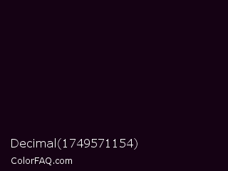Decimal 1749571154 Color is a almost black magenta color and the nearest color is Jaguar #080110. Hex code #150214 and RGB value is rgb(21,2,20). In RGB color space, this color is composed of 8% red, 1% green, 8% blue, In CMYK color space, this color is composed of 0% cyan, 90% magenta, 5% yellow , 92% black , In HSL color space, this color has a hue angle of 303° , 83% saturation and 5% lightness.