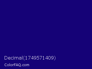 Decimal 1749571409 Color is a dark indigo color and the nearest color is Deep Blue #220878. Hex code #150277 and RGB value is rgb(21,2,119). In RGB color space, this color is composed of 8% red, 1% green, 47% blue, In CMYK color space, this color is composed of 82% cyan, 98% magenta, 0% yellow , 53% black , In HSL color space, this color has a hue angle of 250° , 97% saturation and 24% lightness.