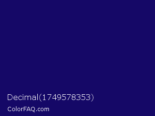 Decimal 1749578353 Color is a very dark indigo color and the nearest color is Arapawa #110c6c. Hex code #150867 and RGB value is rgb(21,8,103). In RGB color space, this color is composed of 8% red, 3% green, 40% blue, In CMYK color space, this color is composed of 80% cyan, 92% magenta, 0% yellow , 60% black , In HSL color space, this color has a hue angle of 248° , 86% saturation and 22% lightness.