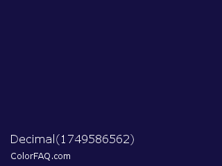 Decimal 1749586562 Color is a very dark indigo color and the nearest color is Haiti #1b1035. Hex code #151042 and RGB value is rgb(21,16,66). In RGB color space, this color is composed of 8% red, 6% green, 26% blue, In CMYK color space, this color is composed of 68% cyan, 76% magenta, 0% yellow , 74% black , In HSL color space, this color has a hue angle of 246° , 61% saturation and 16% lightness.